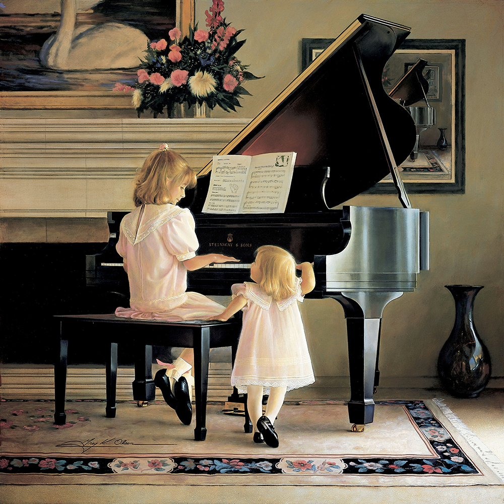This painting is called “Dress Rehearsal”. She and her sister posed at the piano where the painting would eventually end up. I love the self referential nature of the artwork — if you look closely you can see the painting of the girls (more specifically the piano) in the top right corner of the painting. And that painting has the painting in it too.1 I believe my friend Geoff took a photo of us in that room but I don’t know if I ever saw the print. I should ask him.